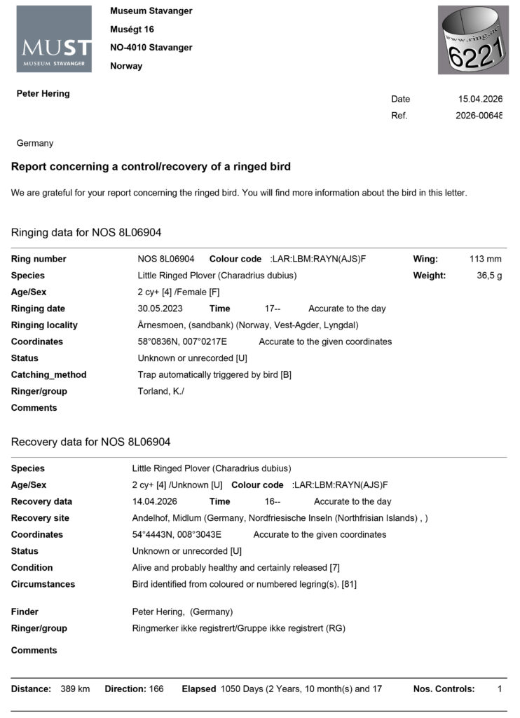 Ich habe die Ringdaten an die Vogelwarte übermittelt und bekam prompt die Antwort.