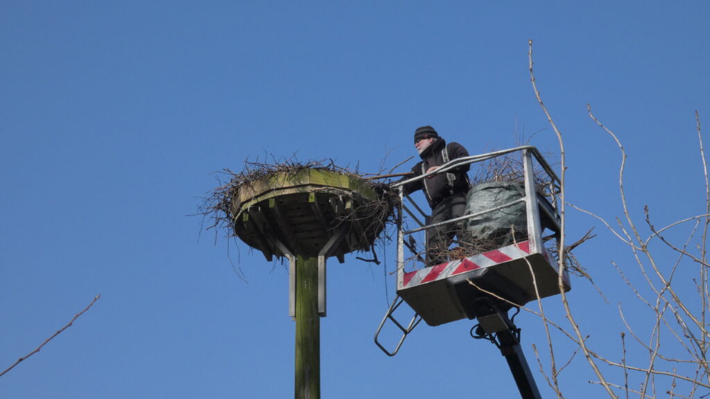Februar 2025. Nestreinigung im Park an der Mühle. Wir danken dem Grünbau der Stadt Wyk für die alljährliche und bisher kostenfreie Nutzung. Das ist in Zukunft nicht mehr der Fall. Deswegen stellen wir diese aufwändigen und freiwillig durchgeführten Nestreinigungen außerhalb des Storchenparkes ein. Leider . — Vielleicht findet sich jemand der das übernimmt ? — Es ist leider für die betroffenen Nester sehr wichtig, denn die Störche nutzen die Nester ganzjährig und im Frühling sind sie vollgekotet.
